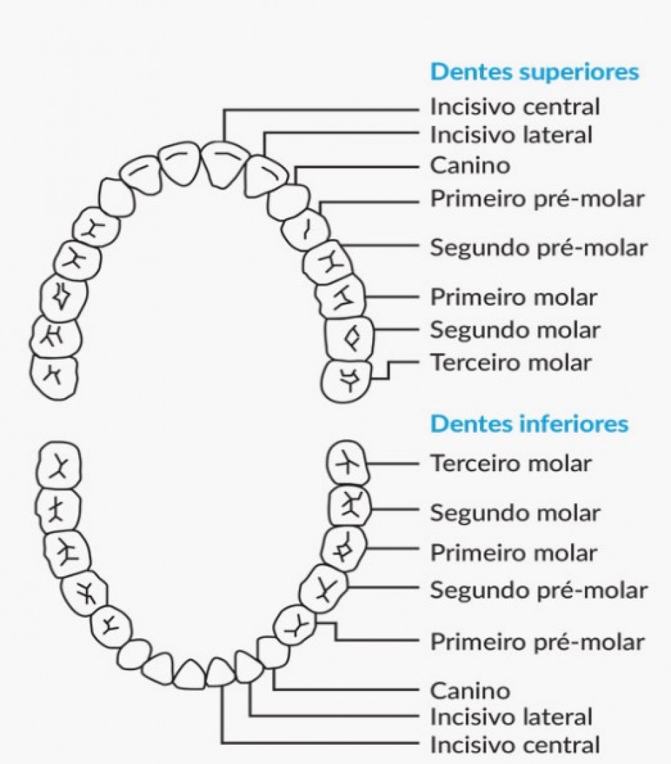 A principal função dos dentes é realizar a mastigação dos alimentos. Os dentes são classificados de acordo com a posição e a função. Assim, temos: