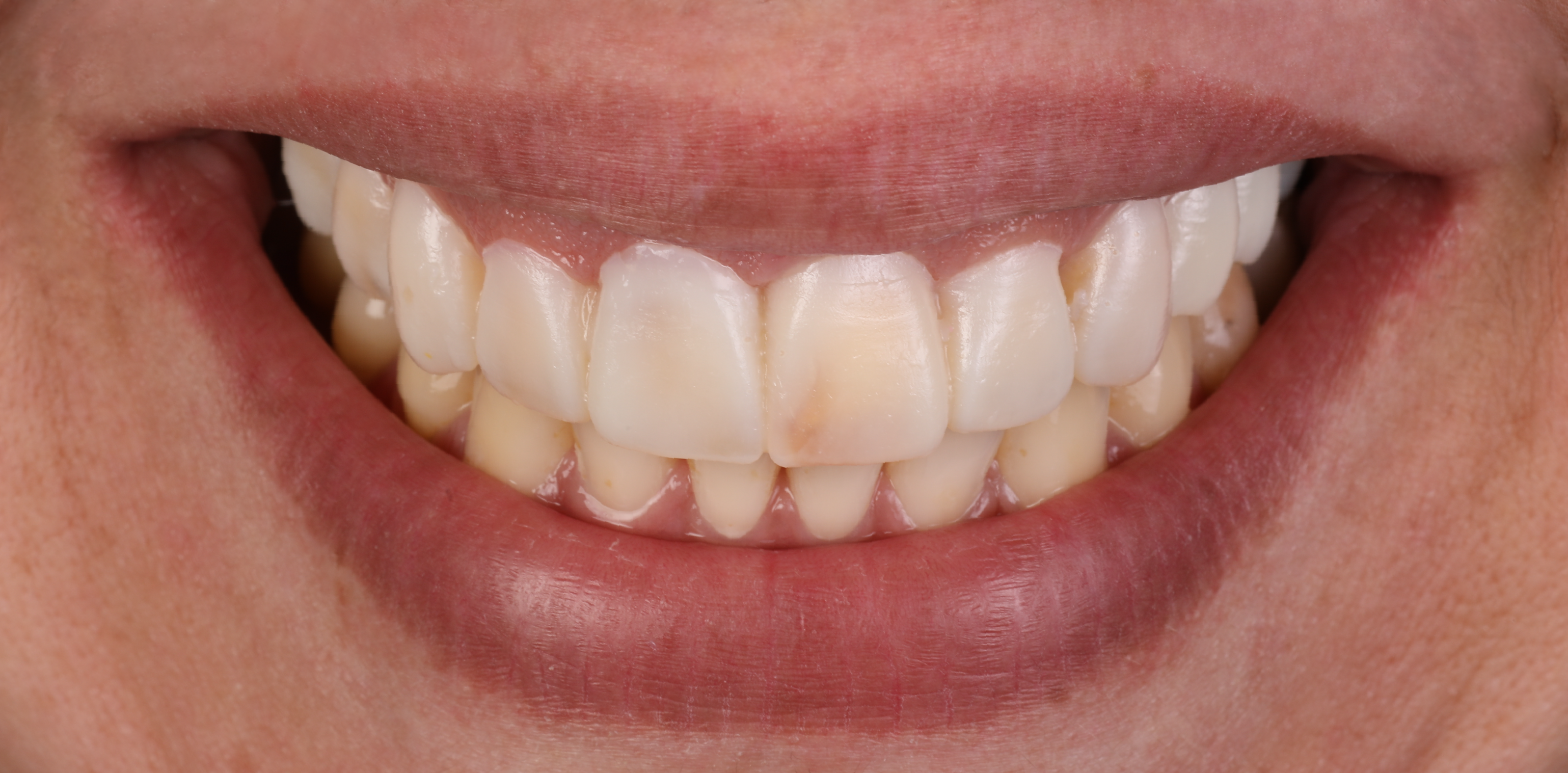 No final do tratamento de ortodontia, o que obtivemos foi um sorriso mais uniforme, que nos permitia direcionar agora a nossa atenção exclusivamente para a reabilitação oral.