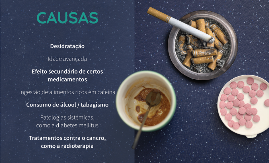 A xerostomia surge devido à diminuição da quantidade de saliva produzida pelas glândulas salivares. As causas para o seu surgimento são variáveis e podem englobar: